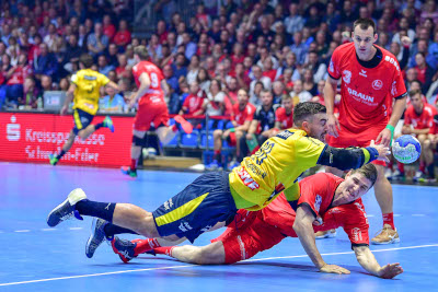 Melsungen kommt besser in dieses Spiel, das von Anfang an auch der erwartete Abnutzungskampf ist. Nationalspieler Julius Kühn ballert zum 1:0, 2:0 und 3:1 (4.). Uwe Gensheimer hält mit seinem ersten Siebenmeter zum 3:2 dagegen (7.), die Vorarbeit kommt von Jannik Kohlbacher. Apropos Arbeit: Was da am Kreis los ist in der Rothenbachhalle! Kohlbacher hat es unter anderem mit den Riesen Finn Lemke und Kühn zu tun. In der Abwehr machen es die Melsunger zunächst deutlich besser als die Löwen.