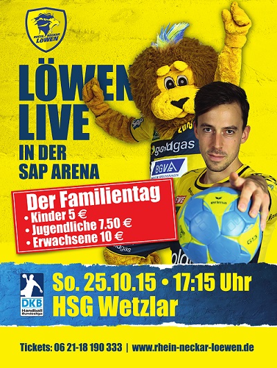 Zu diesem besonderen Spieltag gibt es außerdem familienfreundliche, stark-vergünstigte Ticket-Konditionen für Jedermann: So kosten Tickets für Kinder nur 5 €, Karten für Jugendliche 7,50 € und Erwachsene können schon für 10 € Zutritt zum Spitzenspiel gegen die HSG Wetzlar bekommen. Sichern Sie sich jetzt noch Tickets für den großen Familien-Tag der Rhein-Neckar Löwen!